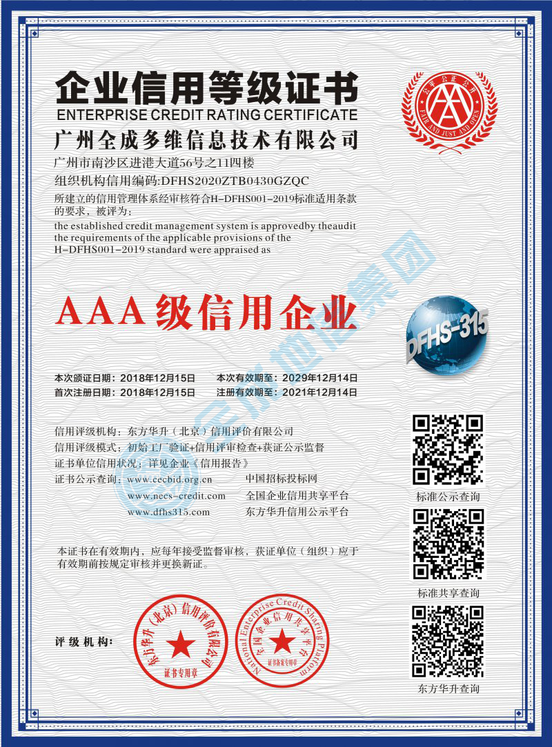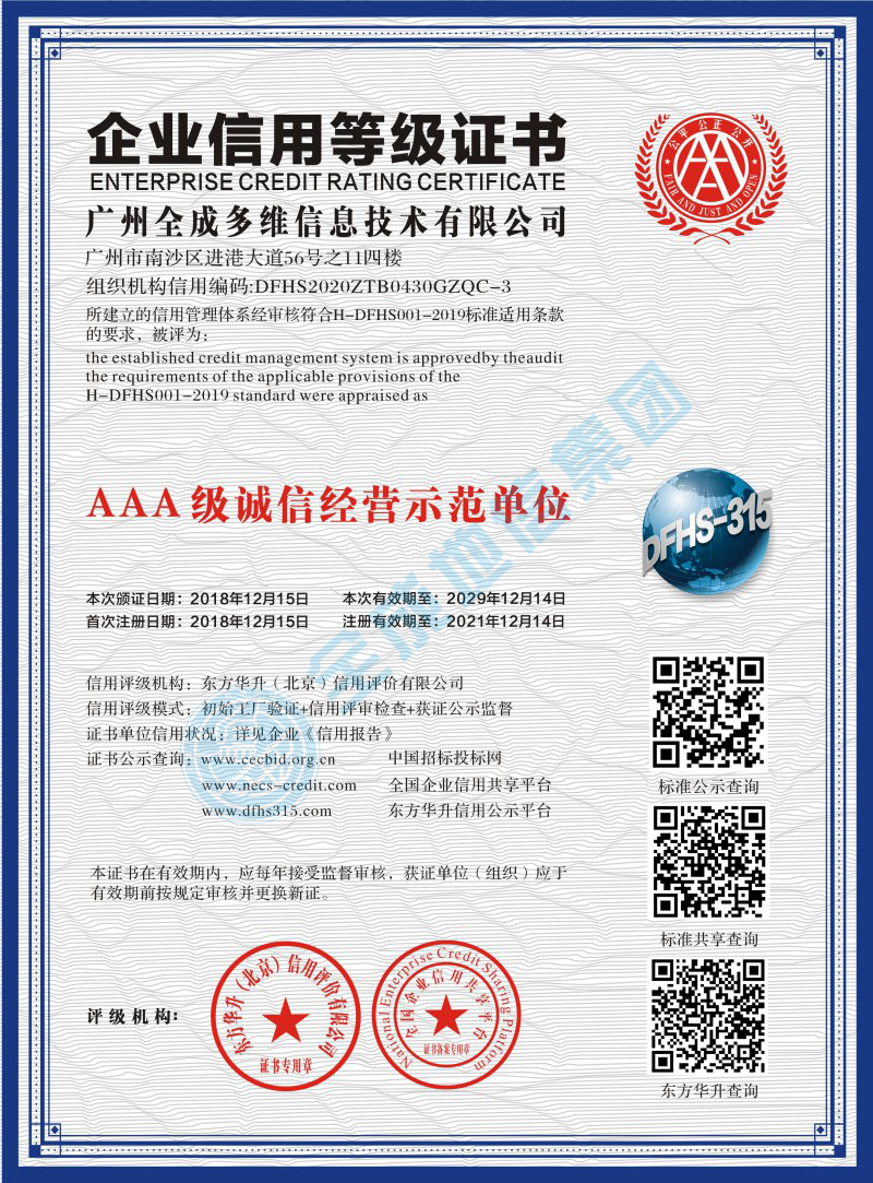 企業(yè)信用等級(jí)證書AAA級(jí)質(zhì)量服務(wù)誠(chéng)信單位